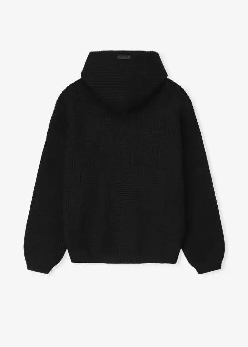 Waffle Black Hoodie is knitted from a heavy waffle knit and cut in an oversized, 90s-inspired silhouette with exaggerated proportions and dropped shoulders for a relaxed drape. Refined details include rib-knit cuffs, and waist hem, finished with a Fear of God Essentials rubberized label stitched on the hood. Keep it fresh and trendy with the Essentials Hoodie and our Essentials Sweatpants.